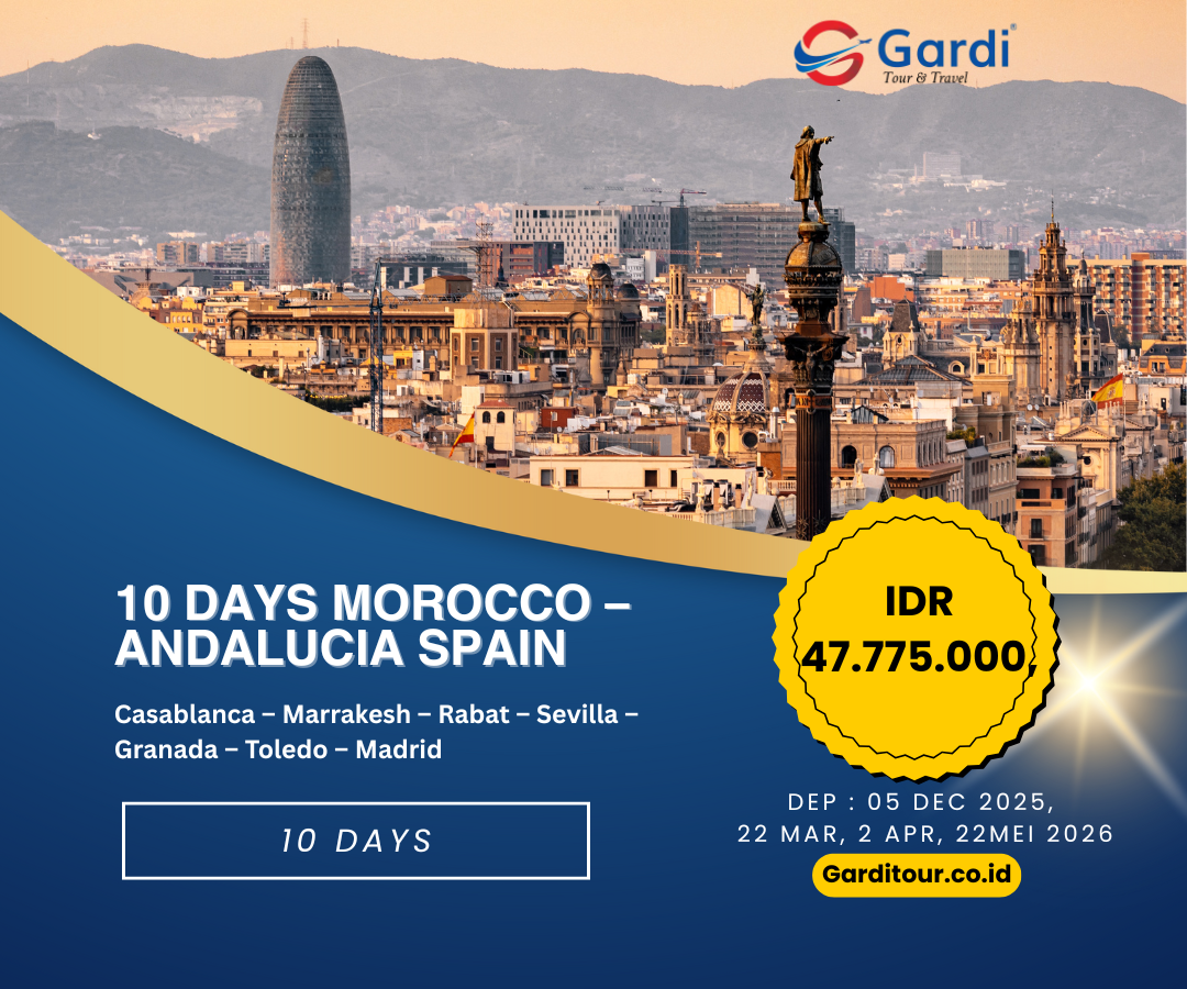 Rasakan perpaduan budaya, sejarah, dan keindahan arsitektur yang menakjubkan melalui paket eksklusif 10 Days Morocco – Andalucía Spain. Perjalanan ini akan membawa Anda menjelajahi pesona eksotis Maroko — dari Casablanca yang modern, Rabat yang bersejarah, hingga kota biru Chefchaouen dan keindahan Fez yang sarat tradisi. Petualangan berlanjut menyeberangi Selat Gibraltar menuju Andalusia, Spanyol, kawasan legendaris yang menjadi saksi kejayaan peradaban Islam di Eropa. Di sana, Anda akan terpukau oleh keanggunan Alhambra Palace di Granada, kemegahan Mezquita Mosque di Cordoba, serta pesona kota romantis Seville.