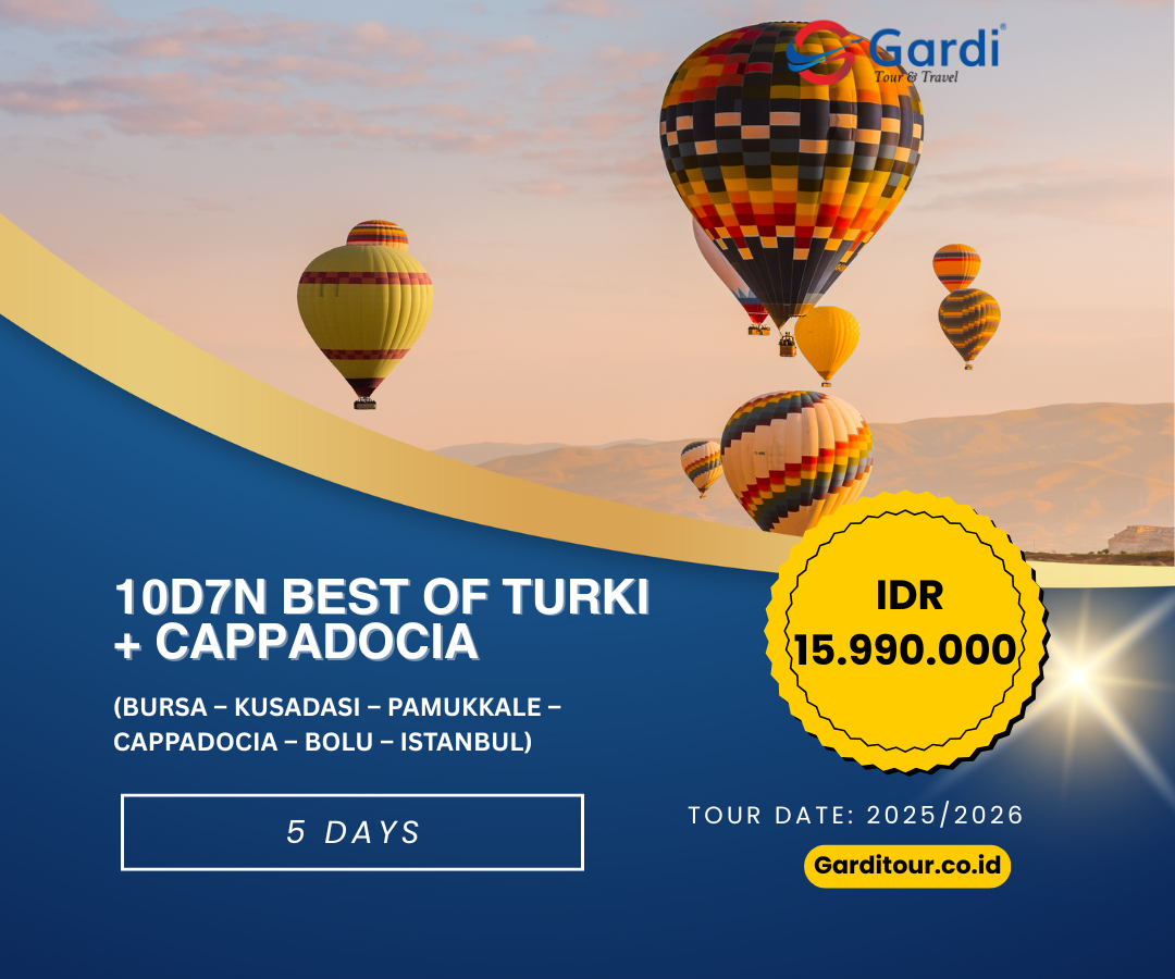 Turki + Cappadocia. Dalam perjalanan ini, Anda akan diajak mengunjungi kota-kota ikonik seperti Istanbul, Bursa, Kusadasi, Pamukkale, Konya, hingga Cappadocia yang terkenal dengan lanskap uniknya bak negeri dongeng. Saksikan keindahan Blue Mosque dan Hagia Sophia, jelajahi situs bersejarah Ephesus, nikmati panorama kolam travertine putih di Pamukkale, serta rasakan pengalaman tak terlupakan menaiki Hot Air Balloon di Cappadocia.