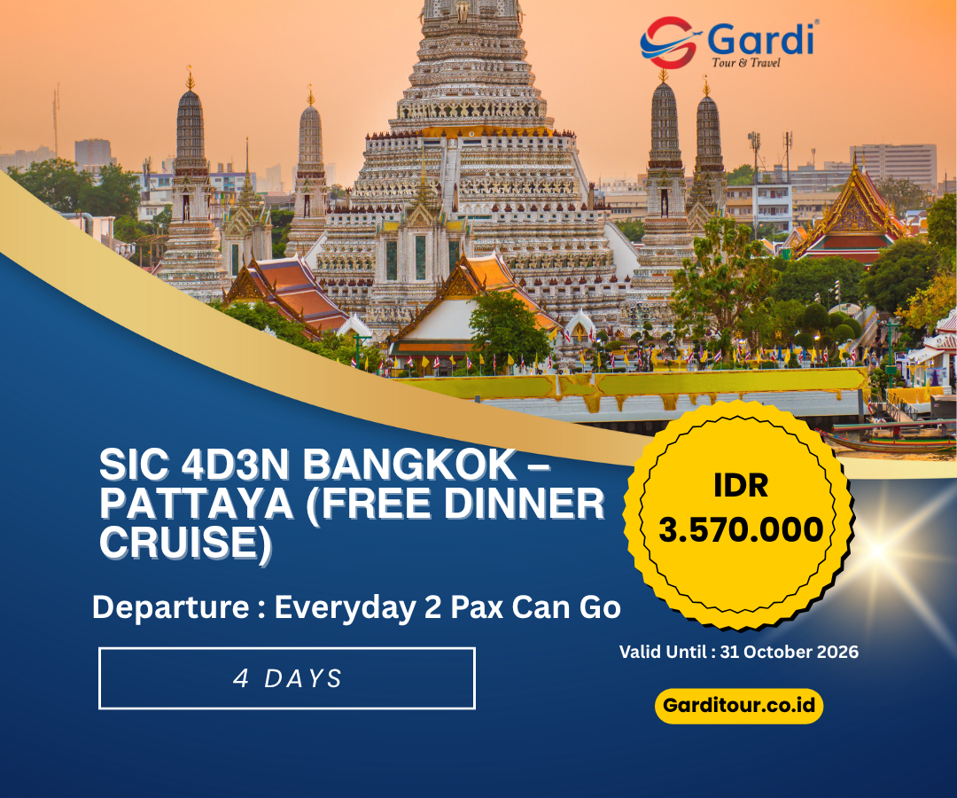 Bagi kamu yang mencari paket wisata Thailand yang praktis dan lengkap, SIC 4D3N Bangkok – Pattaya (Free Dinner Cruise) adalah pilihan tepat. Dalam empat hari, kamu bisa menjelajahi dua kota ikonik — Bangkok dan Pattaya — sambil menikmati kombinasi wisata budaya, belanja, pantai, dan kuliner khas negeri Gajah Putih.