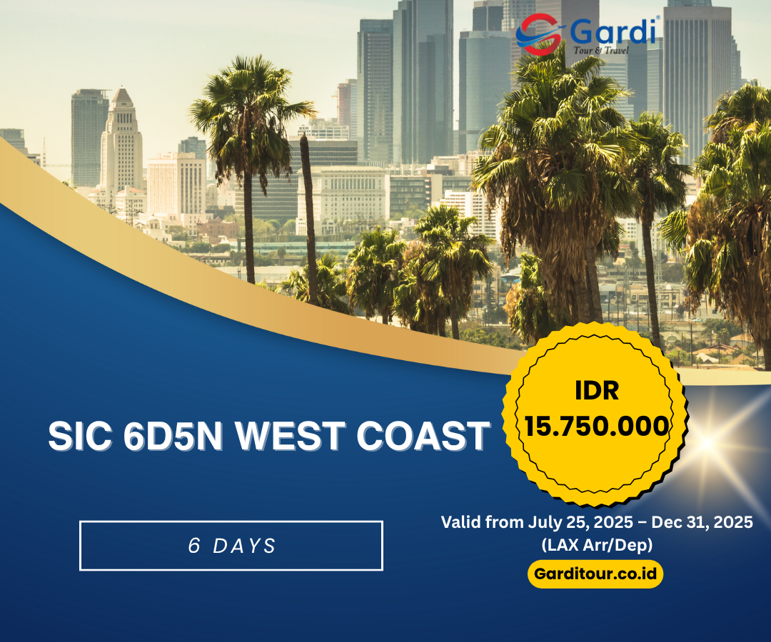 Nikmati serunya menjelajahi pesisir barat Amerika Serikat dalam paket Seat-In-Coach 6 Hari 5 Malam yang membawa Anda ke destinasi ikonik seperti Los Angeles, Las Vegas, dan San Francisco. Saksikan kemegahan kota hiburan dunia, pemandangan gurun Nevada yang dramatis, serta keindahan pantai dan jembatan legendaris di California.